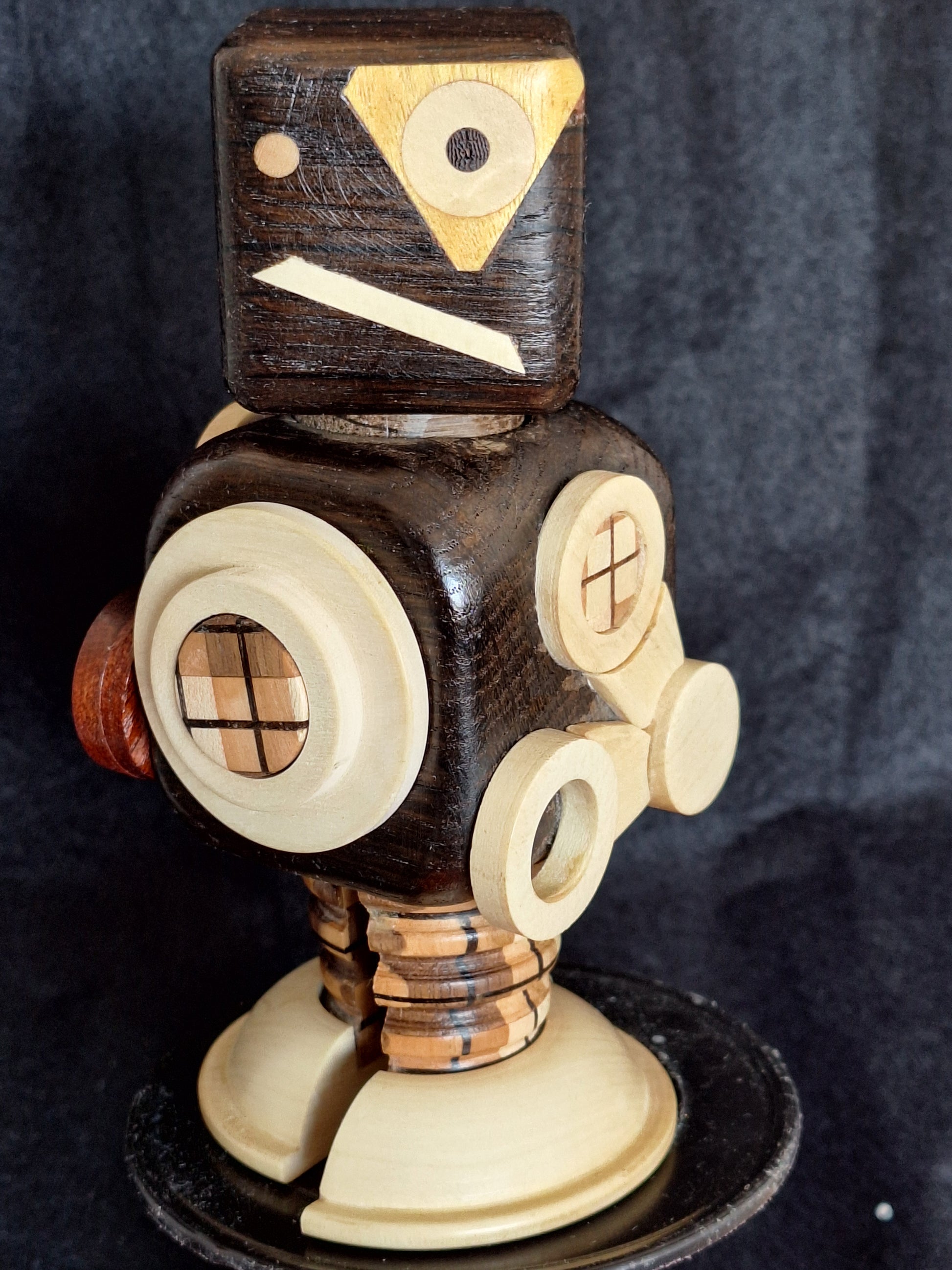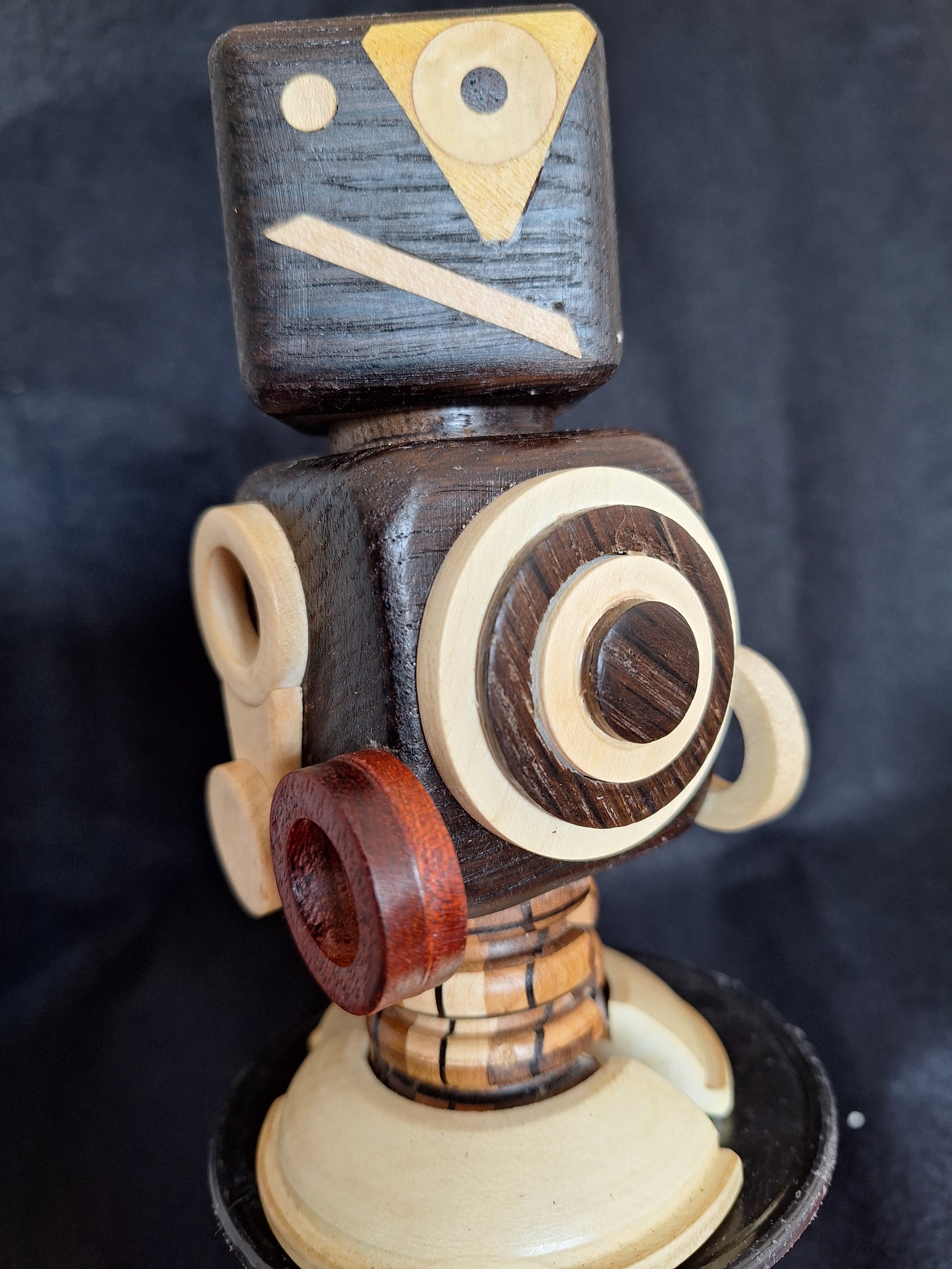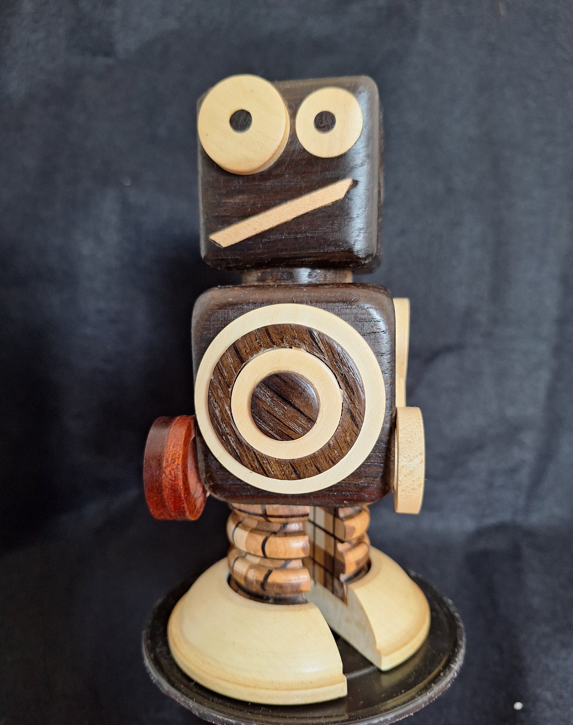 The robot had been crafed in solid hardwoods. The facial features are painstakingly inlaid, 34 individually handmade polished components.