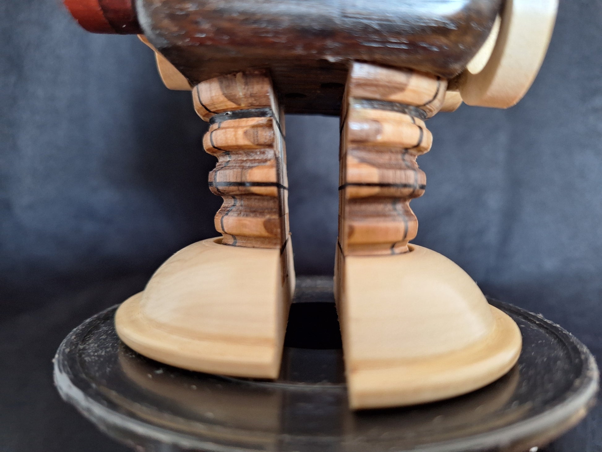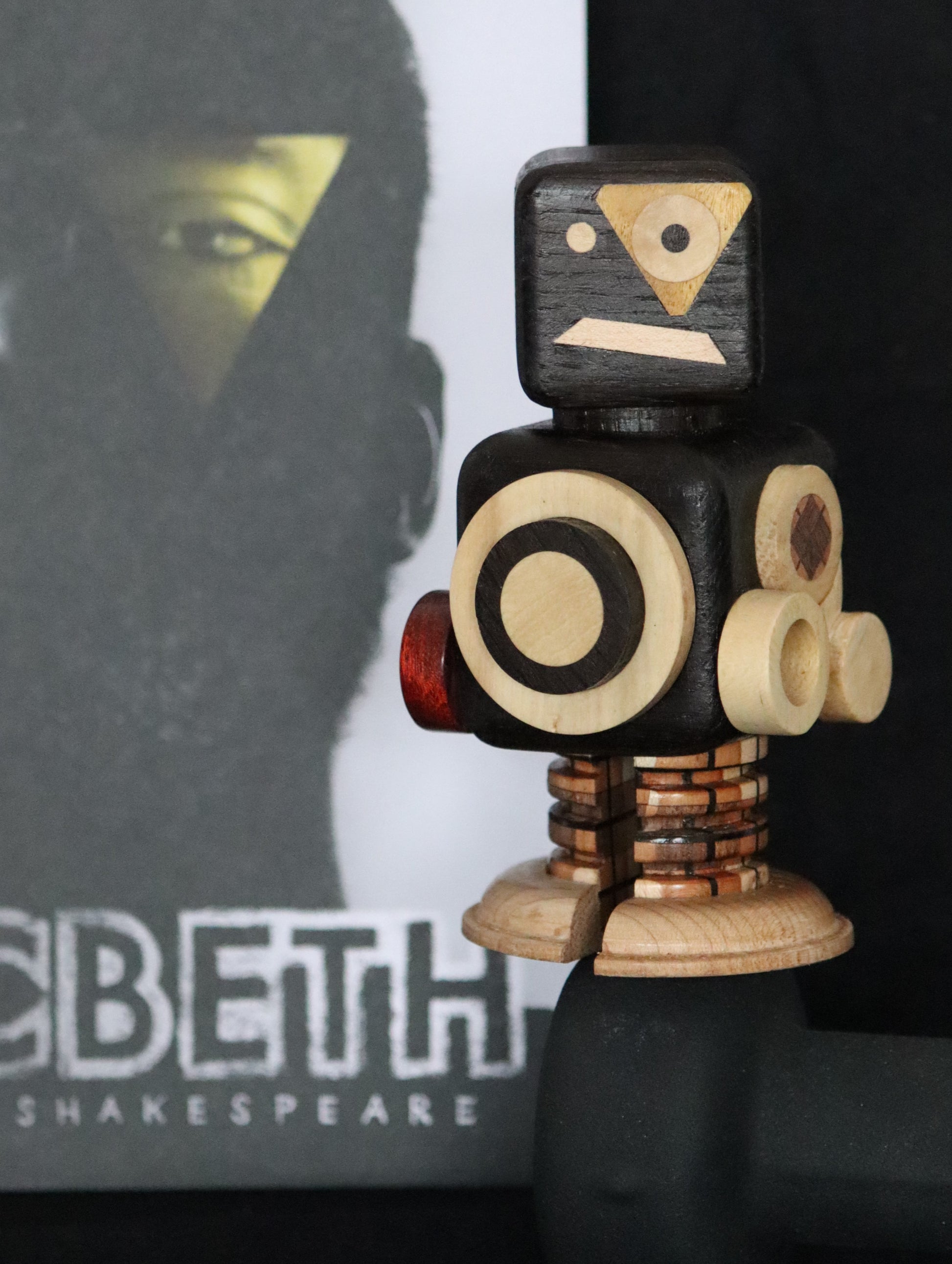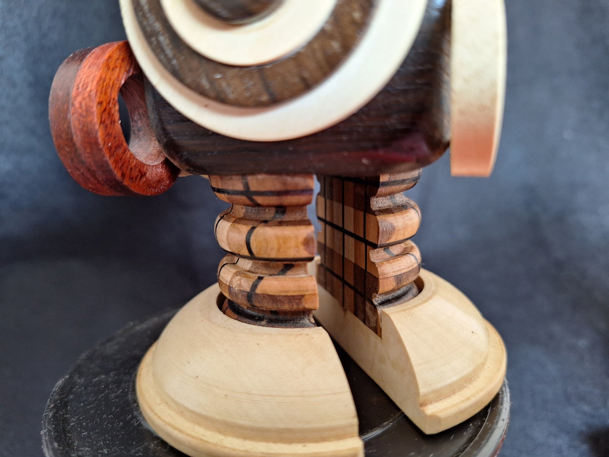 The robot had been crafed in solid hardwoods. The facial features are painstakingly inlaid, 34 individually handmade polished components.